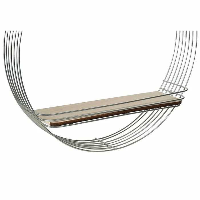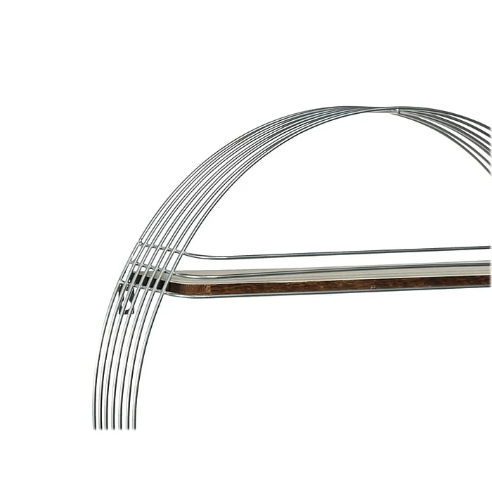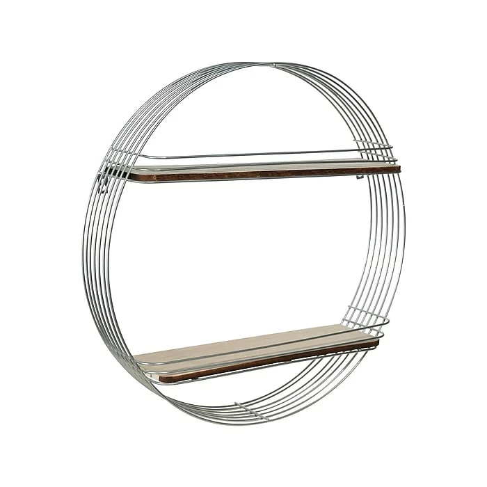 - Made of sturdy metal in silver-tone finish with wooden shelves in brown