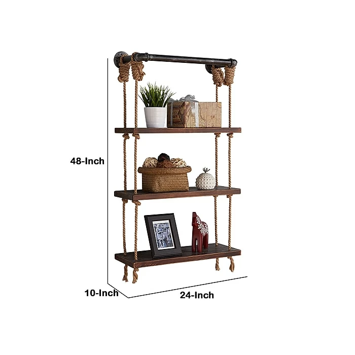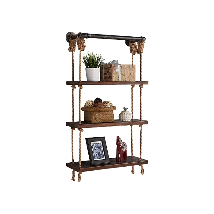 - Three-tier rope hanging wall shelf in industrial style is perfect for organizing books, CDs, DVDs, and much more