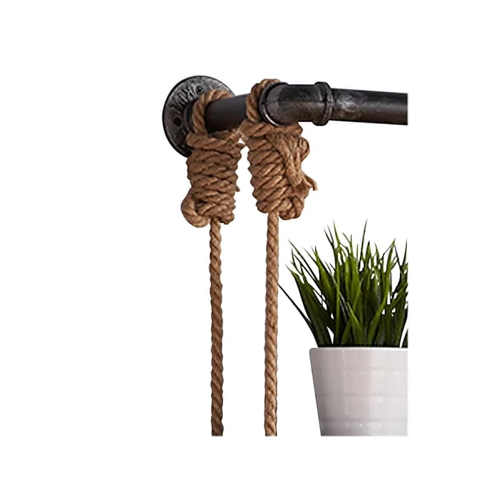 - Metal pipe construction with wooden shelves that are suspended using ropes to form a ladder-like structure