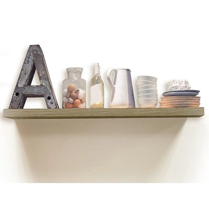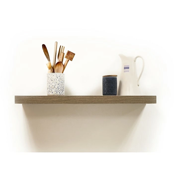 Organize your home and free countertops from clutter with a decorative wall shelf. The brackets have a simple installation with a single leveling step. Both brackets are attached to a floating bar to make installation a snap. This functional wall shelf offers an attractive storage space that is perfect for laundry rooms, mudrooms, kitchens, family rooms, bedrooms, or playrooms.