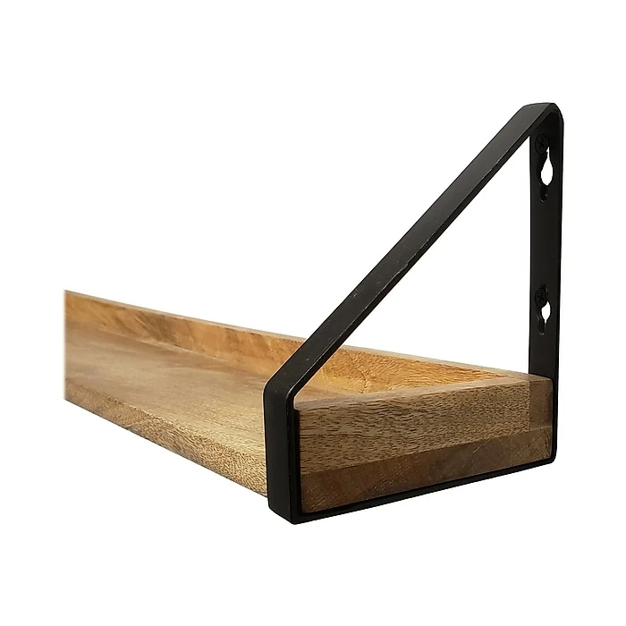 This Eden Grove Shelving real-wood ledge with metal brackets has a smooth surface with rounded edges and an even tapered style. The sturdy metal brackets enhance the ledge and are simple to install. The finish of the real wood varies in color due to the nature of the natural material. The look of reclaimed wood is part of the trendy accent this ledge will make to your home or office.