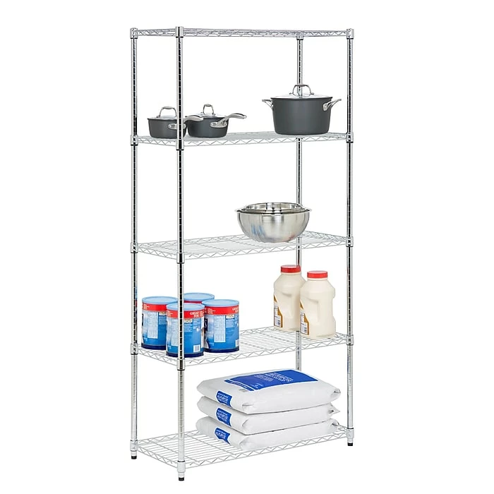 Honey-Can-Do SHF-06832 5-Tier Steel Urban Adjustable Storage Shelving Unit, Chrome. Create visible, accessible storage space instantly with Honey-Can-Do industrial shelving systems. Contemporary chrome finish and steel frame make this unit the perfect blend of style and functionality. Durable enough for the home, garage, pantry, or commercial kitchen; this commercial grade shelving is capable of withstanding up to 350lbs per shelf. Adjustable shelves allow you to change the configuration as your storage needs evolve. Combine multiple units to create a customized storage wall. The no-tool assembly allows you to construct in minutes a shelving unit that will last for years.