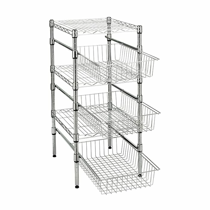 - A flexible storage solution that adjusts in height to accommodate tall or shorter items in most cabinets. Also good for pantry organization, the contemporary design and brilliant chrome finish present a polished look when you open your cabinets. Handy and sizable, the wire basket pulls out for easy access to anything from food items to under-the-sink cleaning supplies. This shelf works best in cabinets that are 18 inches wide or larger.