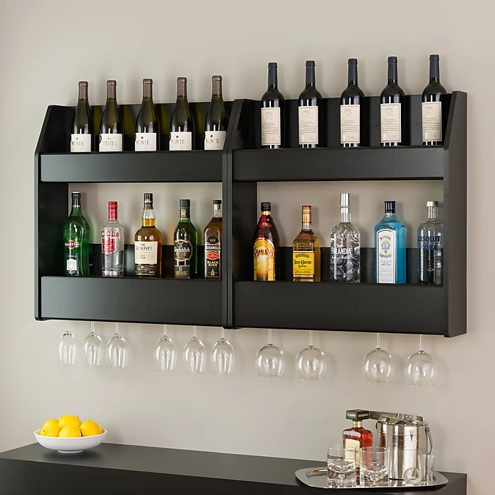 Proudly display your wine or liquor collection with this two tier floating wine and liquor rack. The unique wall mounted system has a compact design to conserve space in your bar, living room, kitchen, or dining area. Slide your stemmed wine glasses into the hidden channel underneath to store both bottles and glasses in one convenient location. Solid construction and available in a variety of finishes to complement any existing décor. Mount individually or as a pair to increase your storage space. This product ships “Ready to Assemble” and includes an instruction booklet for easy assembly and installation.