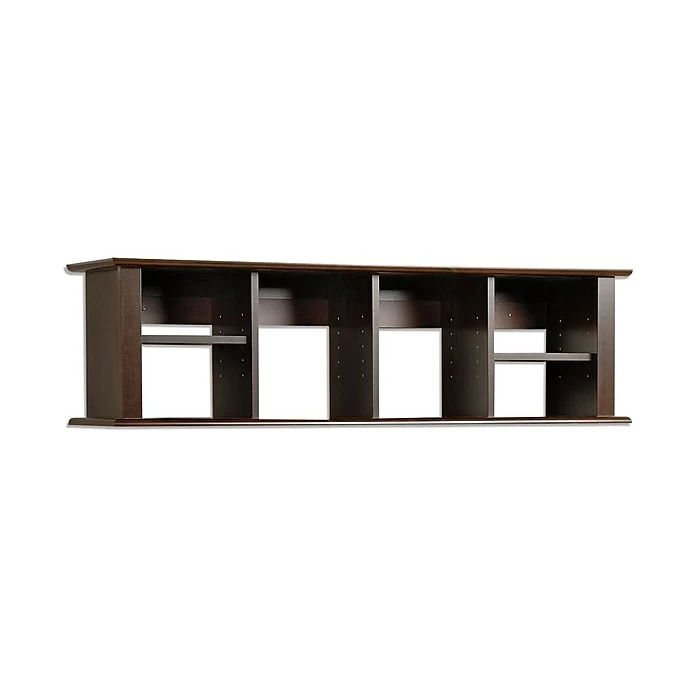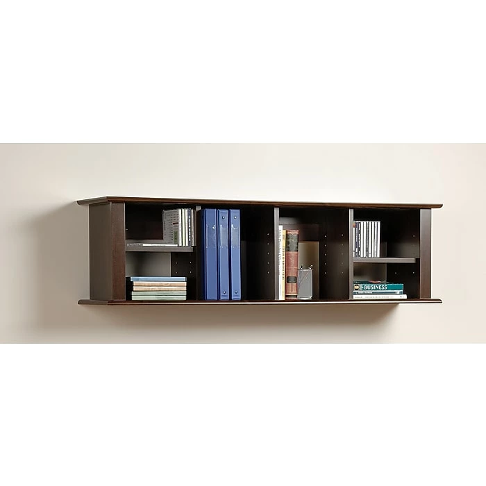 Prepac™ Wall mounted desk hutch in espresso laminate as four adjustable shelves and fits binders perfectly and can also be used as a floating bookcase or a curio for collectibles. Hutch has dimensions of 48″W x 13″H x 11 1/2″D.