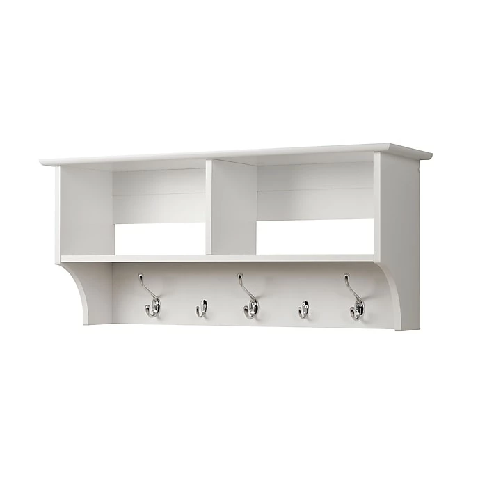 Prepac™ 36″ Hanging entryway shelf in white finish helps keep your gloves, hats, coats and jackets organized. Shelf easily mounts to wall with its innovative 36″ Hanging rail system providing a sleek and traditional look.